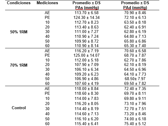 Aunque no se midieron las presiones arteriales durante el ejercicio, los valores obtenidos inmediatamente después de culminado el ejercicio CR son una aproximación a lo que pudo estar ocurriendo durante el mismo. El hecho de que la PAs estuviera levemente elevada (alrededor de 7 mmHg) luego de realizar ejercicio al 50% y al 70% de 1RM, mientras que la diastólica mantuvo sus valores similares, reafirma lo expuesto por Carpio y Solera (2012), en el sentido de que tras el ejercicio CR, los valores de PAs de mujeres hipertensas medicadas de aproximadamente 53 años fueron significativamente mayores al realizar ejercicio aeróbico, CR y concurrente, en comparación con la condición control, mientras que la diastólica se mantuvo estable cinco minutos posterior a la finalización del ejercicio.