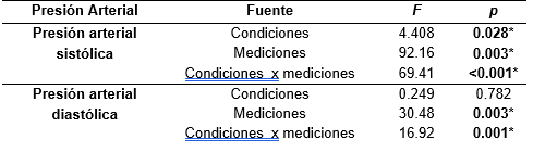 En la Tabla 2 se aprecian los resultados de los análisis de varianza de dos vías. Como se puede notar, se encontraron interacciones significativas entre condiciones y mediciones, tanto para la PA sistólica (p=0.003) como para la PA diastólica (p˂ 0.001).