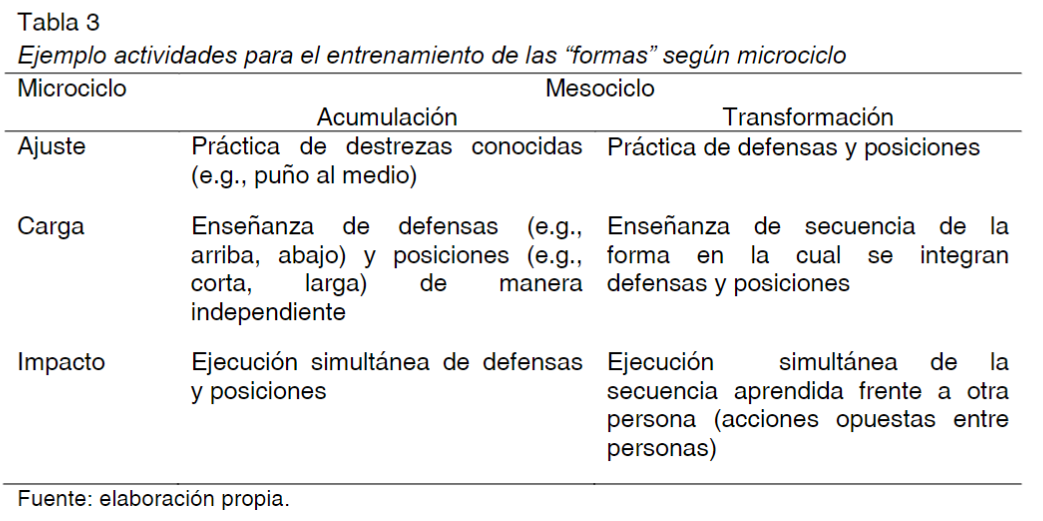 Dando continuidad al ejemplo anteriormente mencionado, en un sucesivo macrociclo se le puede dar seguimiento al perfeccionamiento de la misma “forma” o bien se podría seguir el mismo patrón en cada uno de los mesociclos, pero enfatizando en elementos más específicos que no se lograron en el anterior ciclo (e.g., precisión de movimientos, energía, velocidad, etc.). En la Tabla 3 se presentan ejemplos de posibles actividades a realizar en el entrenamiento de las “formas” en los microciclos de ajuste, carga e impacto para un mesociclo de acumulación y otro de transformación.