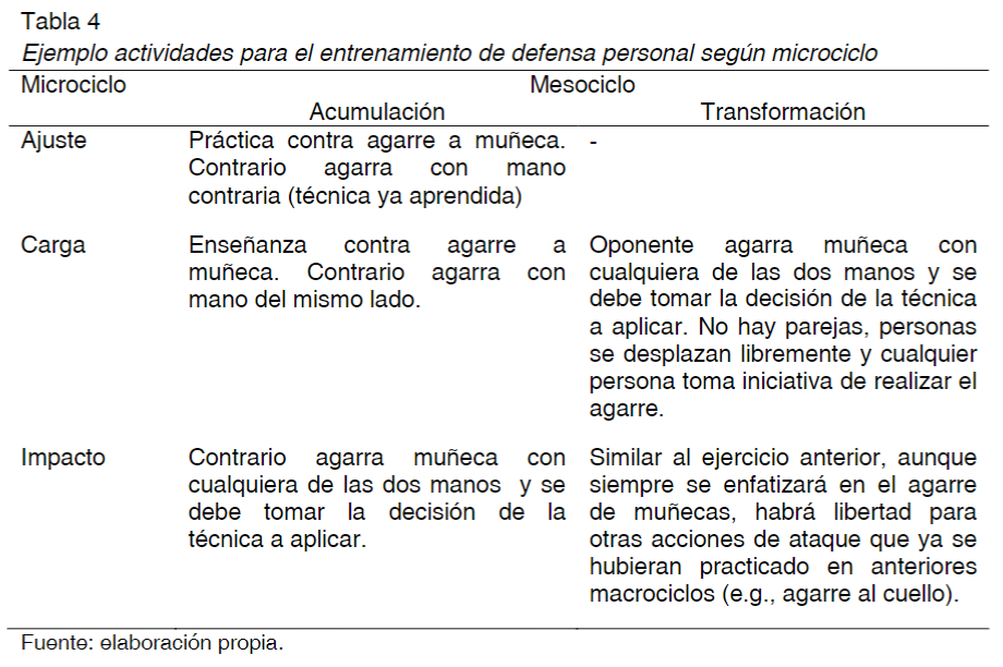 En la Tabla 4 se ejemplifican posibles actividades a ejecutar en distintos microciclos que pretenden el desarrollo de contenidos concernientes a la defensa personal.