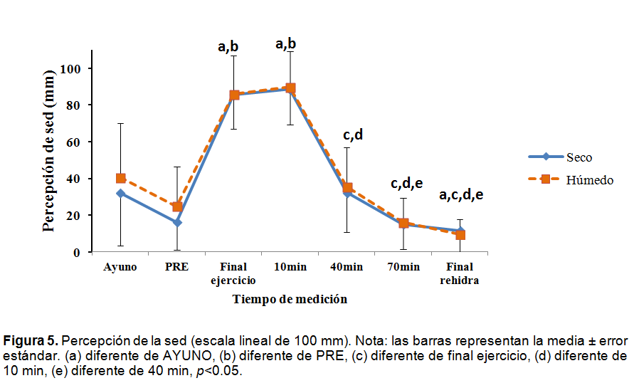 Cuando se analizó el comportamiento postejercicio, se encontró que la escala de percepción de sed se comportó según lo previsto: como puede observarse en la Figura 5, la sed se elevó considerablemente al final del ejercicio y se mantuvo elevada los primeros diez minutos del período de rehidratación, sin que se presentaran diferencias significativas entre las dos condiciones ambientales. Este resultado, combinado con una mayor percepción de calor para la condición de calor seco comparada con el calor húmedo (Figura 4), confirma que la percepción de sed es sensible a la deshidratación real y sugiere que no se ve afectada por condiciones ambientales como las utilizadas en este estudio.