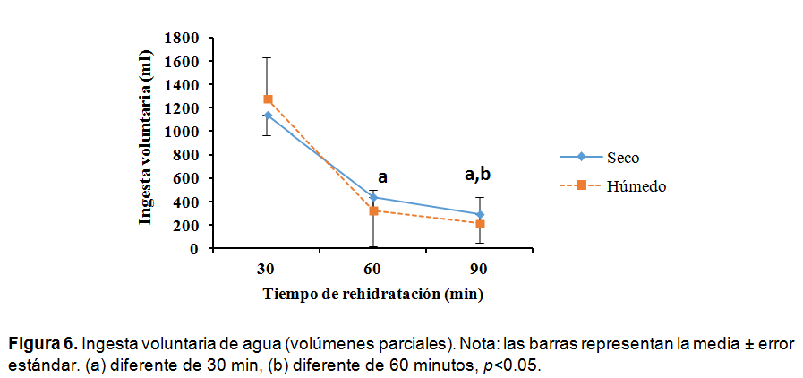 La Figura 6 muestra las ingestas voluntarias parciales de agua durante el período de rehidratación. La interacción entre condición ambiental y tiempo de medición no fue significativa (p=0.113). Tampoco hubo diferencia entre sesión seca (623 ± 58 ml) y sesión húmeda (606 ± 48 ml) (p=0.741), pero sí hubo un efecto significativo del tiempo sobre la ingesta voluntaria (p<0.001); el análisis post hoc mostró que todos los tiempos de medición fueron distintos entre sí (1208 ± 61 ml en los primeros 30 minutos, 382 ± 66 ml en la segunda media hora y 253 ± 54 ml para los últimos 30 minutos, p<0.05). La ingesta voluntaria total de agua fue de 1869 ± 655 ml para el clima seco y 1818 ± 534 ml para el clima húmedo (p=0.741).