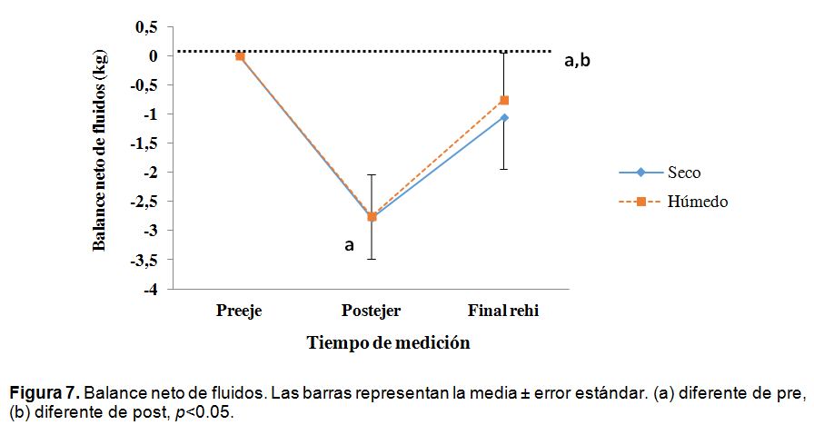 El balance neto de fluidos al final del ejercicio y al final de la rehidratación se presenta en la Figura 7. La interacción entre condición ambiental y tiempo de medición no fue significativa (p=0.436). Tampoco hubo un efecto principal de la condición ambiental (p=0.192). Sí hubo diferencias significativas en el tiempo (p<0.001); el análisis post hoc muestra que el balance neto de fluidos fue distinto entre todas las mediciones (p<0.005): 0.00 ± 0.00 kg preejercicio, -2.77 ± 0.19 kg postejercicio y -0.90 ± 0.20 kg al final de la rehidratación voluntaria.