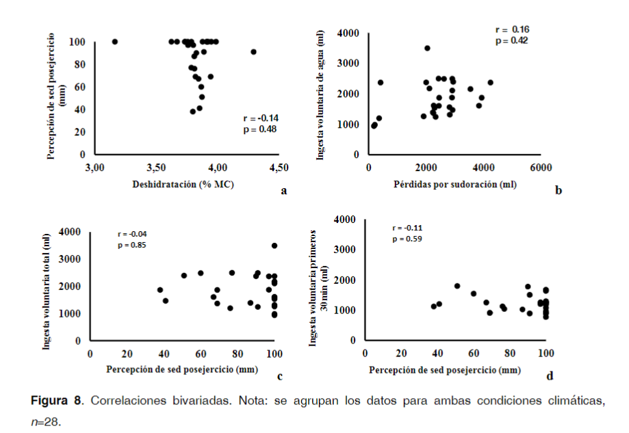 Por otro lado, la investigación no encontró relación alguna entre la percepción de sed al final del ejercicio y la ingesta voluntaria posterior de agua, ya sea que se analice la ingesta total de los 90 minutos (r=-0.04, p=0.85) o solamente la ingesta de los primeros 30 minutos (r=-0.11, p=0.59) (Figuras 8c y 8d). Finalmente, la ingesta voluntaria de agua postejercicio no fue distinta para las dos condiciones ambientales de nuestro estudio (Figura 6), a pesar de que la percepción de calor durante la rehidratación era distinta entre ellas (Figura 4). Estos datos son consistentes con lo sugerido previamente por Solera-Herrera y Aragón-Vargas (2006): la ingesta voluntaria de líquido no refleja las necesidades reales de hidratación ni la sensación de calor.