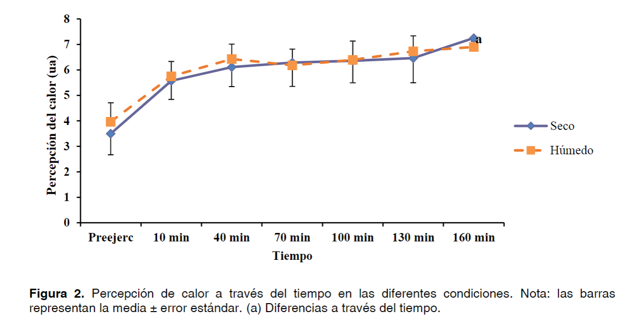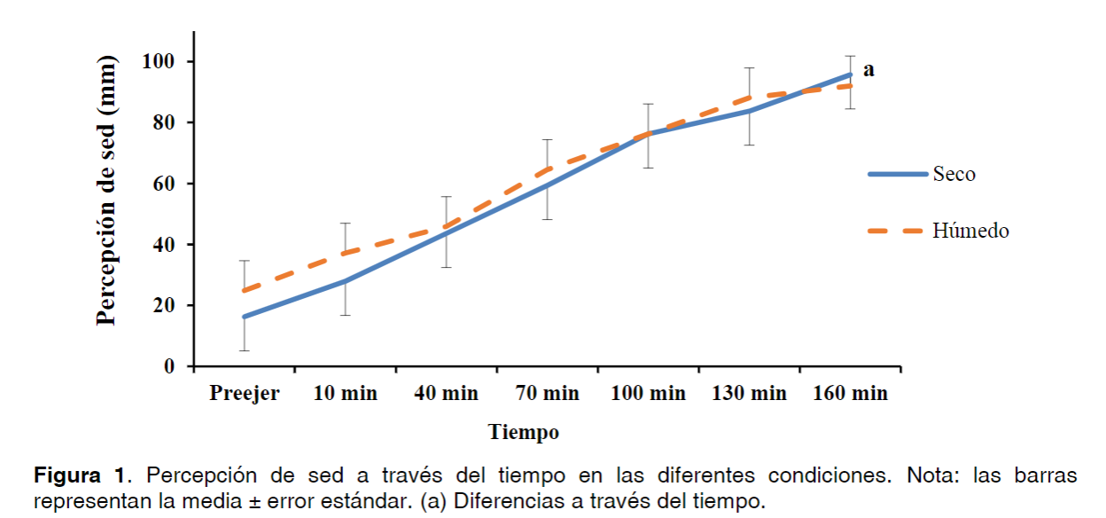 Los resultados del estudio mostraron que la percepción de la sed y calor durante el ejercicio tienen el mismo comportamiento en condiciones climáticas distintas (calor seco y calor húmedo) con el mismo nivel de estrés térmico. En ausencia de líquido durante el ejercicio en el calor, la percepción subjetiva de sed fue capaz de identificar la deshidratación con una relación directa (más deshidratación-más sed) y, en condiciones ambientales distintas (seco- húmedo), con el mismo nivel de estrés térmico, este efecto se presentó igual para ambas.