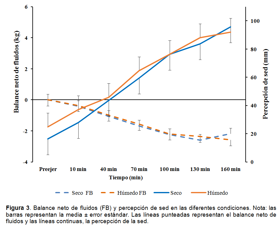 En resumen, este estudio muestra que la escala percepción de sed utilizada les permitió a los participantes detectar claramente la deshidratación ocurrida por el ejercicio en el calor sin ingesta de líquido, pero mostró mucha variabilidad. Además, posterior al inicio de ingesta de agua, los participantes perdieron toda capacidad predictora del balance neto de fluidos. Las condiciones de calor seco y húmedo utilizadas fueron suficientemente distintas como para ser percibidas por los participantes; sin embargo, no incidieron en la percepción de la sed ni en la ingesta voluntaria de líquido. Finalmente, la ingesta voluntaria de líquido se comportó de manera aleatoria, al no mostrar relación alguna con la necesidad real de líquido ni con la percepción de sed de los participantes. En conclusión, este estudio no respalda la teoría de que la ingesta de agua según la sed sea una buena manera de reponer el líquido perdido por sudoración durante el ejercicio en clima caliente húmedo ni en clima caliente seco.