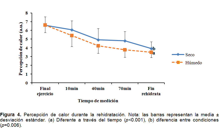 Los ANOVA de percepción de llenura y percepción de cólico no mostraron interacción significativa entre condición ambiental y tiempo de medición, tampoco efectos principales. Sin embargo, como se puede observar en la Figura 4, hubo un efecto principal tanto del tiempo (p<0.001) como de la condición ambiental (p=0.006). en el caso de la percepción de calor (la interacción no fue significativa, p=0.25). Concretamente, la percepción de calor durante el período de rehidratación fue mayor en la condición de calor seco (5.3 ± 0.2 u.a.) que en la de calor húmedo (4.7 ± 0.2 u.a.).