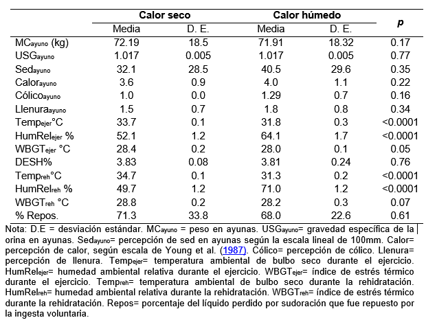 Análisis estadístico. Se calculó la estadística descriptiva de peso y edad para caracterizar a los participantes y se verificó la normalidad de todas las variables de interés. Se compararon los valores iniciales, así como al final del ejercicio en el calor, entre ambas condiciones ambientales (SECO y HUM), mediante pruebas t de Student para muestras relacionadas, de las siguientes variables: gravedad específica de la orina, peso corporal, percepción de la sed, calor, cólico y llenura en ayunas; temperatura de bulbo seco, humedad relativa e índice de estrés térmico durante el ejercicio; deshidratación alcanzada al final del ejercicio; y temperatura de bulbo seco, humedad relativa e índice de estrés térmico, durante la rehidratación.