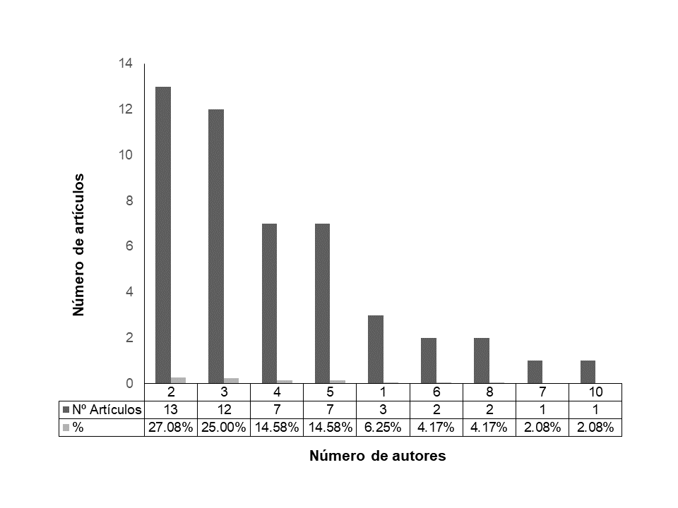 Se encontraron apenas tres artículos con un único autor, siendo el 6,25% de todos los manuscritos catalogados, y los mismos son de autorías diferentes. El predominio de la red de colaboración entre investigadores en los artículos es notable, puesto que 13 producciones fueron realizadas por dos autores, y luego 12 escritos por tres investigadores. Con cuatro autores hay la correspondencia de siete manuscritos, así como la asociación de cinco colaboradores que también contabilizan siete. Dos textos con ocho autores, y otros dos con seis involucrados. Por último, hay un artículo con seis miembros, y otro que contiene la participación de 10 investigadores. Esa tendencia de publicar de forma conjunta se puede explicar, según apunta García, Martrucelli, Rossillo, Denardin, (2010), por un mayor crédito, costeo de investigaciones y legitimación dentro del medio académico. A fin de cuentas, la materialización de un capital en esa esfera ocurre por medio de la producción científica, y por lo tanto la forma más recurrente de obtener una eficiencia de esa productividad proviene de la asociación entre investigadores, principalmente de las denominadas coautorías.