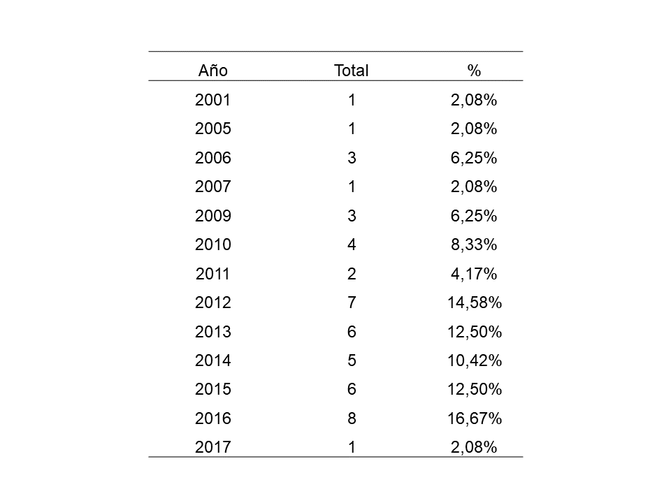 El año 2016 fue el año con mayor número de publicaciones, correspondiendo al 16,67% (ocho artículos), luego aparece el año 2012 con siete artículos, y 2013 y 2015, ambos con un total de seis publicaciones. Como se puede observar, existe una brecha entre los años 2001 y 2005, períodos que también presentan baja producción acerca de la modalidad. Sin embargo, la distribución es relativamente proporcional en cada año, con un alza a partir del año 2012. En relación con la baja producción verificada en 2017, se presupone el retraso en las publicaciones de sus volúmenes, lo que compromete la cronología de la publicación o el caso de las revistas que todavía no disponen sus artículos en esas bases hasta el período final de la catalogación.