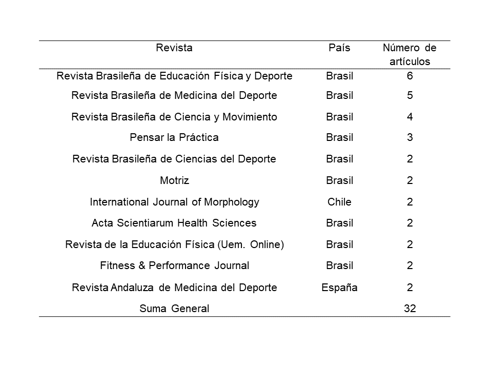 Esos 20 artículos se encuentran en las siguientes revistas: Fitness & Performance Journal (Penedo, Beltrão & Nunes, 2006; Menezes & Fernandes Filho, 2006) Ra Ximhai (Mena-Ramos & Álvarez-Velásquez, 2006) Revista Brasileña de Cineantropometría y Desarrollo Humano (Karloh, Petry, Kraeski, Matias & Frutuoso, 2010), Archivos de Ciencias de la Salud de la Unipar (Gonçalves, Barros Filho & Gonçalves, 2010), Motricidad. European Journal of Human Movement (Vernetta, Fernández, López-Bedoya, Gómez-Landero & Oña, 2011), Revista Brasileña de Ciencia y Movimiento (Pinto Júnior, Sousa, Gaya & Alves, 2012; Del Vecchio, Primeira, Silva, Dall’agnol & Galliano, 2014), Revista de Salud Pública (Souza Menezes, Novaes & Fernandes-Filho, 2012), Revista Brasileña de Medicina del Deporte (Perin, Ulbricht, Ricieri & Neves, 2012; Shigaki et al., 2013), Journal of Human Sport and Exercise (Bobo-Arce & Méndez-Rial, 2013), Revista Brasileña de Educación Física y Deporte (Goulart et al 2014;Santos, Lebre & Carvalho, 2016; Loquet, 2016), International Journal of Morphology (Menezes, Novaes & Fernandes-Filho, 2014; Arriaza et al 2016), Revista Andaluza de Medicina del Deporte (Guimaraes-Ribeiro, Hernández-Suárez, Rodríguez-Ruiz & García-Manso, 2015), Acta Scientarum Health Sciences (Boligon, Deprá, & Rinaldi, 2015) y Revista Salud y Investigación (Silva, Oliveira, Leme, Nascimento Júnior & Anversa, 2016).
