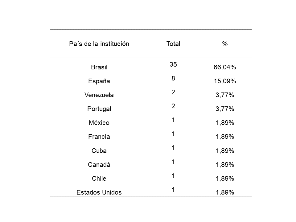 Brasil presenta un número significativo de 35 (64,04%) instituciones vinculadas a los investigadores que publicaron sobre el tema. Luego, España con ocho instituciones, y Portugal y Venezuela con dos instituciones. Con solo una institución, aparecen los siguientes países: Francia, Cuba, México, Canadá, Chile y Estados Unidos.