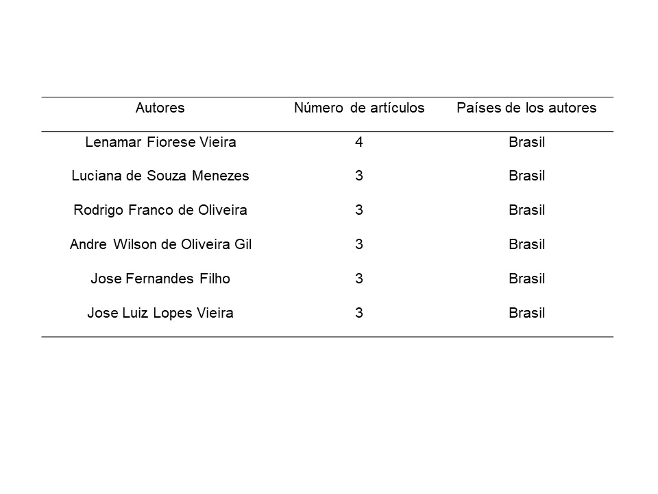En relación con el modelo de producción de los artículos, se verificó la existencia de la red de colaboración de autores a través del número de autores/instituciones que cooperaron entre sí. Esta tendencia en estudios previos de García et al. (2010) ha sido evidenciada como próspera para los investigadores y para el campo científico. En lo tocante al país de la institución donde los autores estaban vinculados, Brasil presentó superioridad, con la suma de 35 instituciones. Luego, España con ocho instituciones y Portugal y Venezuela con dos cada uno y, apenas con una institución asociada están: Francia, Cuba, México, Canadá, Chile y los Estados Unidos. Se observa que el hecho de que la mayoría de los estudios son de Brasil y España puede tener una relación directa de que estos son los países dentro de la delimitación espacial con mayor prominencia en los resultados de las competiciones mundiales. De esta forma, se puede inferir que el universo de la investigación y el avance competitivo está relacionado, existiendo en el área el inicio de una aproximación del hacer científico con el profesional.