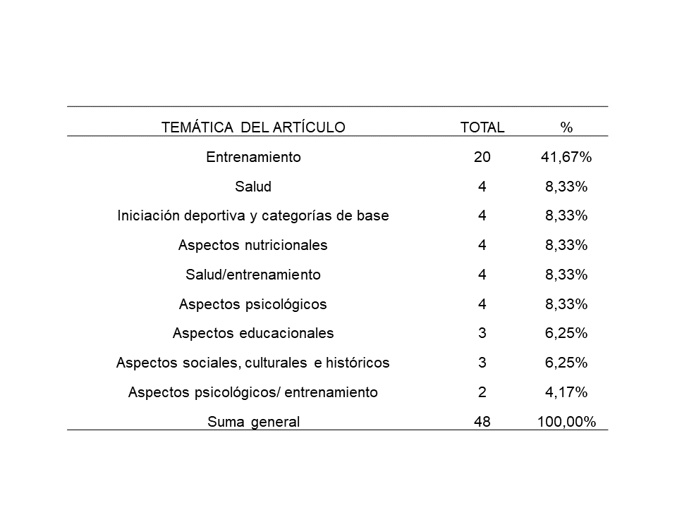 El eje Entrenamiento fue el más recurrente, con un total de 20 artículos (41,67%). (8,33%), Iniciación Deportiva y Categorías de Base (8,33%), Aspectos Nutricionales (8,33%) y artículos clasificados en Salud / Entrenamiento (8,33%) cada uno con cuatro artículos, intensifican la preeminencia epistemológica de las Ciencias Naturales, totalizando el 74,99%. Las demás temáticas: Aspectos Psicológicos que contienen cuatro manuscritos (8,33%), Aspectos Educacionales con tres (6,25%), Aspectos Sociales, Culturales e Históricos también con tres escritos (6,25%) y Aspectos psicológicos / Entrenamiento presentando dos trabajos (4,17%), los que contemplan especificidades de la psicología a favor de la mejora del desempeño. Al total, se suma el 25% de la producción encontrada.