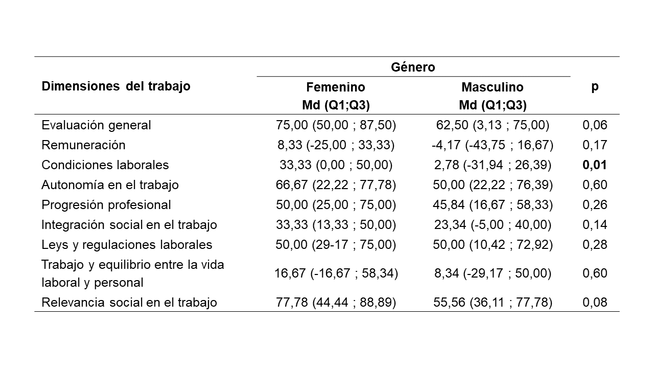 El análisis de la satisfacción laboral según el género de los profesores de Educación Física (Tabla 1) mostró una diferencia significativa solo con la dimensión de condiciones de trabajo (p = 0.01), mostrando que las mujeres estaban más satisfechas que los hombres.