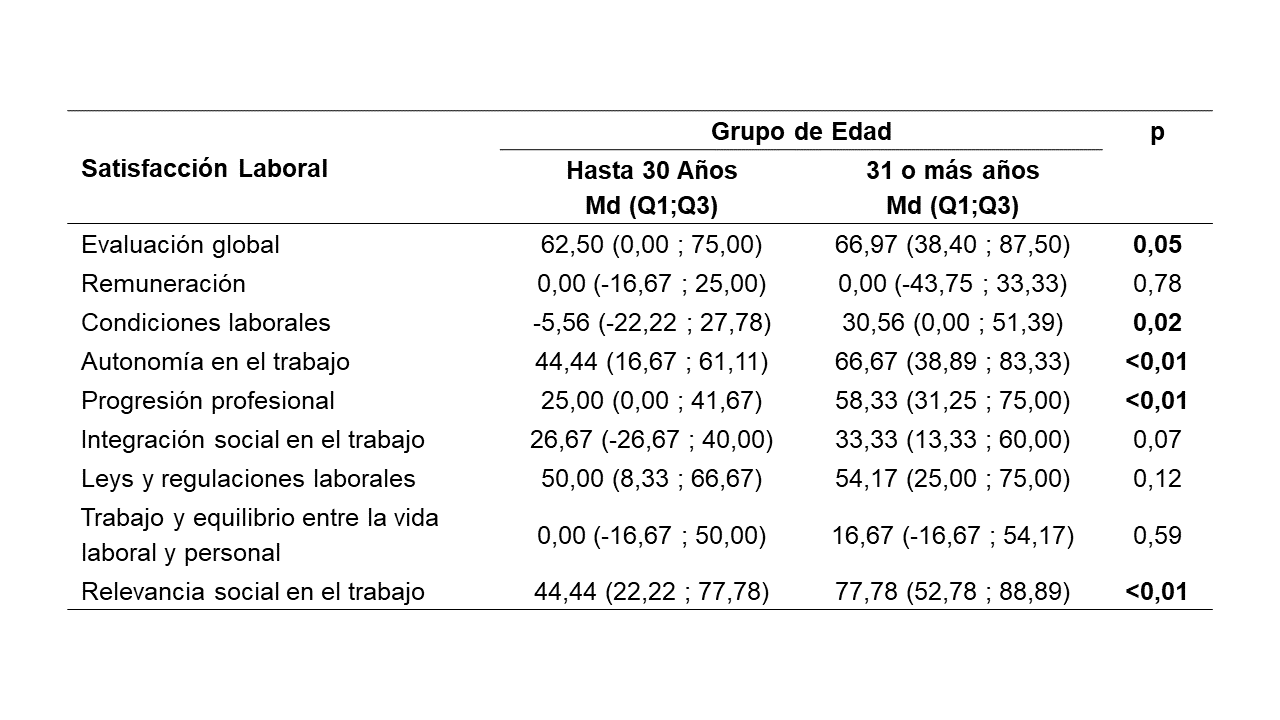 Al evaluar la satisfacción laboral de los profesores según la edad (Tabla 2), se encontró una diferencia estadísticamente significativa en la evaluación general (p = 0.05) y en las dimensiones de condiciones de trabajo (p = 0.02), de autonomía en (p <0.01), de progresión profesional (p <0.01) y de relevancia social del trabajo (p <0.01), con docentes de hasta 30 años menos satisfechos que docentes con más de 31 años