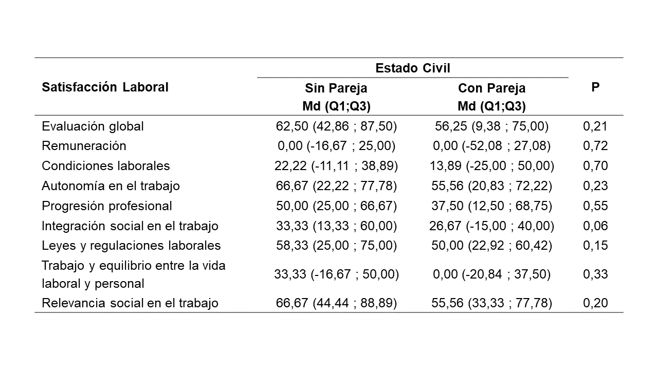Al analizar la satisfacción laboral, considerando el estado civil de los profesores de Educación Física de la red municipal de educación (Tabla 3), no hubo diferencias estadísticamente significativas en la evaluación general ni en las dimensiones de trabajo evaluado entre docentes sin y con pareja.