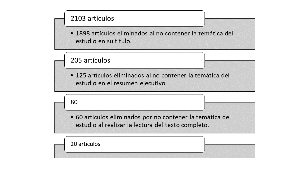 Finalmente, las investigadoras leyeron los 80 artículos resultantes. No obstante, más de la mitad de ellos fueron excluidos en el apartado metodológico. Además, cabe destacar que no se tuvo acceso al texto completo de dos de los artículos, por lo que se tuvieron que excluir. En total, se analizaron 20 artículos científicos cuya población incluye a deportistas nulíparas con incontinencia urinaria, que constituyen la muestra para la elaboración de esta investigación.