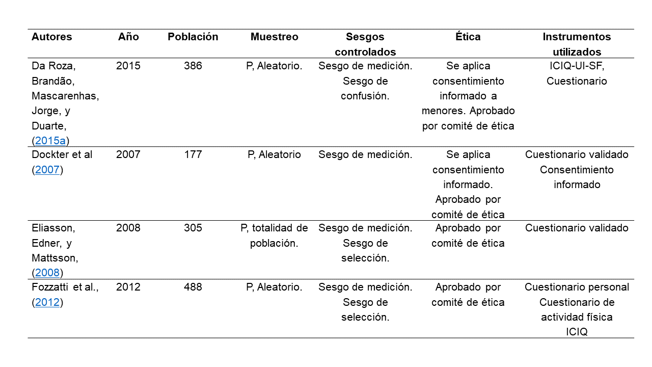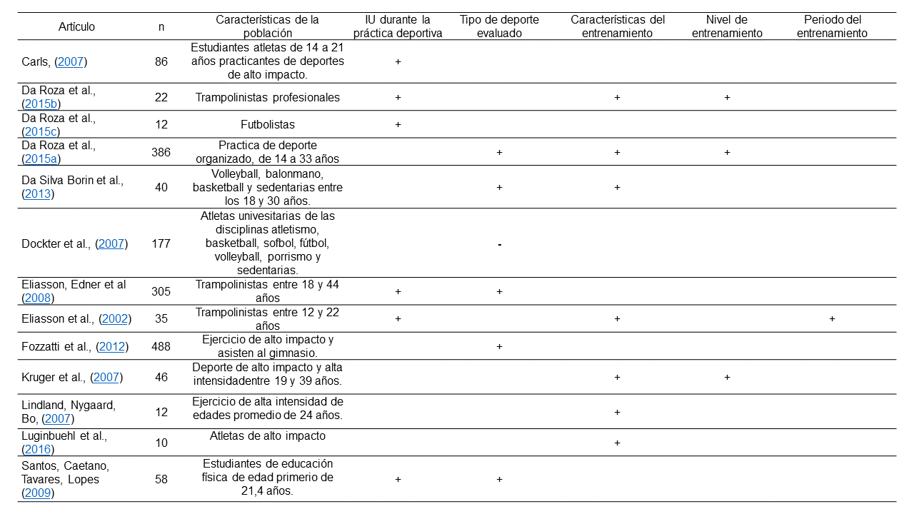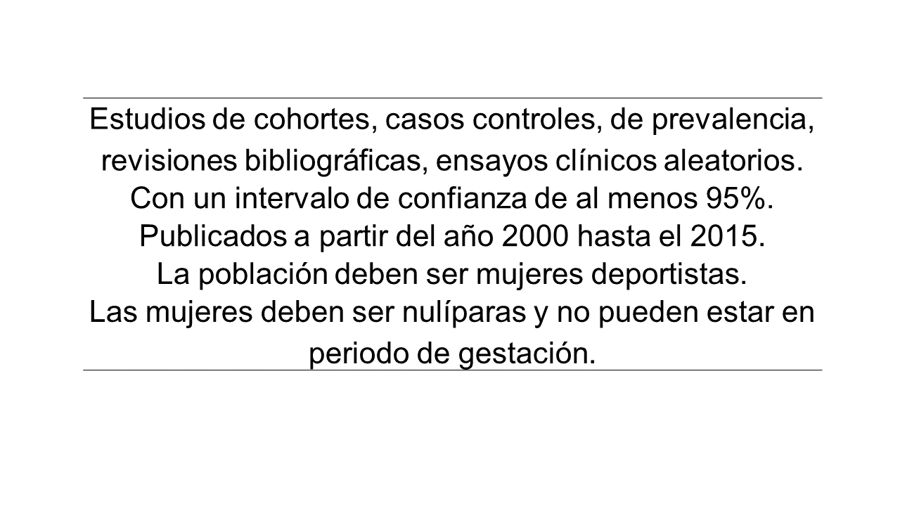 Población. Se analizaron artículos publicados entre los años 2000 y 2015. Además, debían estar escritos en los idiomas español, inglés y portugués, haber sido publicados en revistas científicas e incluir deportistas nulíparas con el padecimiento de incontinencia urinaria. Se utilizó una estrategia de búsqueda combinando los siguientes descriptores en los tres idiomas mencionados: en español “incontinencia urinaria de esfuerzo”, “femenino”, “factores de riesgo”, “prevalencia”, “ejercicio”, y los mismos en su traducción correspondiente al inglés (stress urinary incontinence, female, risk factor, prevalence, exercise) y portugués (incontinência urinaria de esforço, mulher, fatores de risco, prevalência, exercício). La estrategia de búsqueda utilizada fue la siguiente: