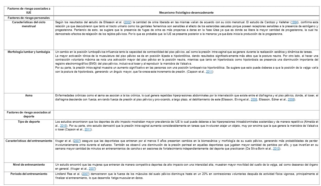 Asimismo, Eliasson, Elving et al. (2008) aseguran que las nulíparas con diagnóstico de lumbalgia, tienen >3 prevalencia de IUE que aquellas que están sanas. En su estudio, es más común en aquellas que aseguran tener lumbalgia recurrente. Eliasson, Edner et al. (2008) demostraron que el estreñimiento fue el factor que se vio mayormente asociado con IU, triplicando el riesgo de padecerla en su presencia. Esto se explica por el mal funcionamiento del intestino al comprimir la vejiga, lo cual complica la retención urinaria (Higa, Lopes y Dos Reis, 2008). Asimismo, Markwell (2001) concluye que cuando existe dificultad para defecar puede ser el resultado de la baja actividad tónica del PP y del descenso perineal.