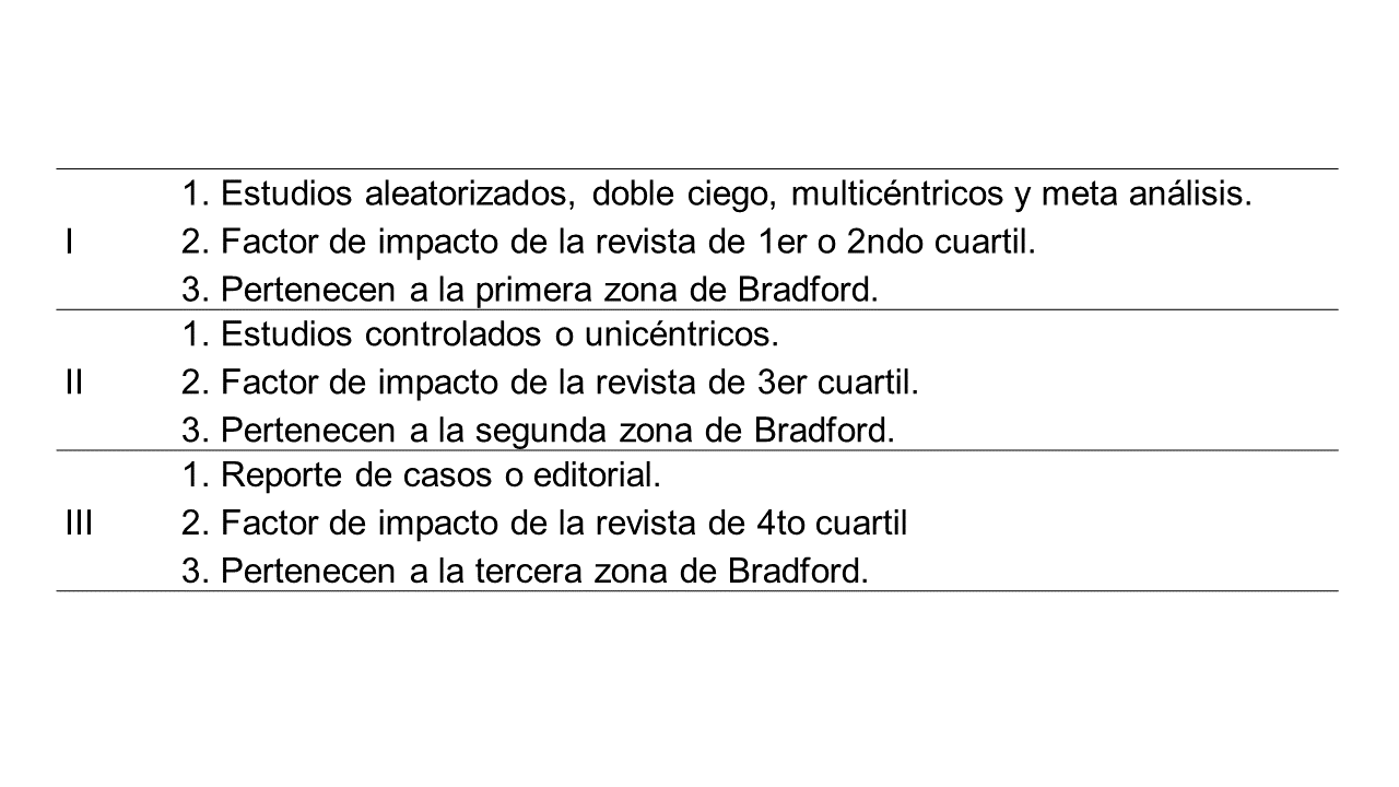 Se utilizaron tres diferentes metodologías para revisar la validez de los estudios: clasificarlos en nivel I, II o III según criterios relacionados con el tipo de metodología, el factor de impacto de la revista en la que fue publicado el artículo, y la zona de Bradford delimitada según la ley con el mismo nombre (tabla 2). El artículo debía cumplir 2 de 3 criterios para clasificarse en el nivel de validez correspondiente. La segunda forma se basó en los criterios según la US Agency Healthcare Research and Quality.