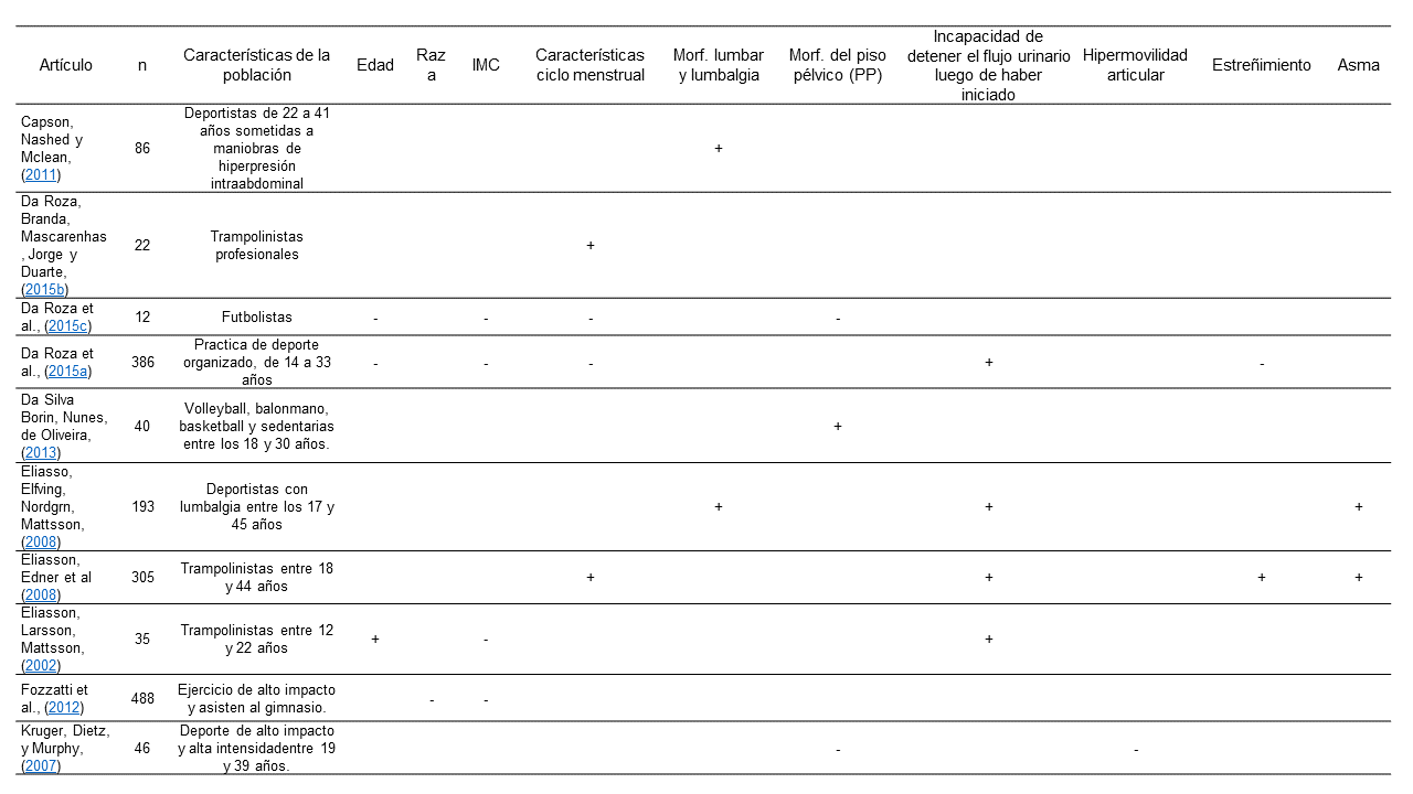 A continuación, se presentan los factores de riesgo (FR) estudiados en el periodo del 2000 al 2015, sintetizados en un cuadro resumen y divididos en según sean características propias de la persona (tabla 4) o si se asocian al deporte que ésta práctica (tabla 5). En los casos en los que el estudio concluye que un elemento aumenta la probabilidad de padecer IUE en mujeres deportistas se representa con un signo de suma (+), mientras que en el caso contrario se coloca un signo de resta (-). Por otro lado, las casillas en blanco indican que los autores no evaluaron dicho factor.