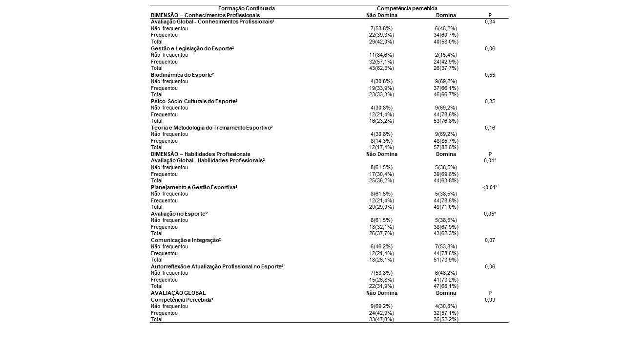 Ao analisar a relação existente entre formação continuada e competência profissional (Tabela 1), observou-se que os treinadores que frequentaram cursos de formação nos últimos cinco anos apresentaram índices mais elevados de domínio nos indicadores Planejamento e Gestão Esportiva (p<0,01), Avaliação no Esporte (p=0,05) e na dimensão Habilidades Profissionais (p=0,04).