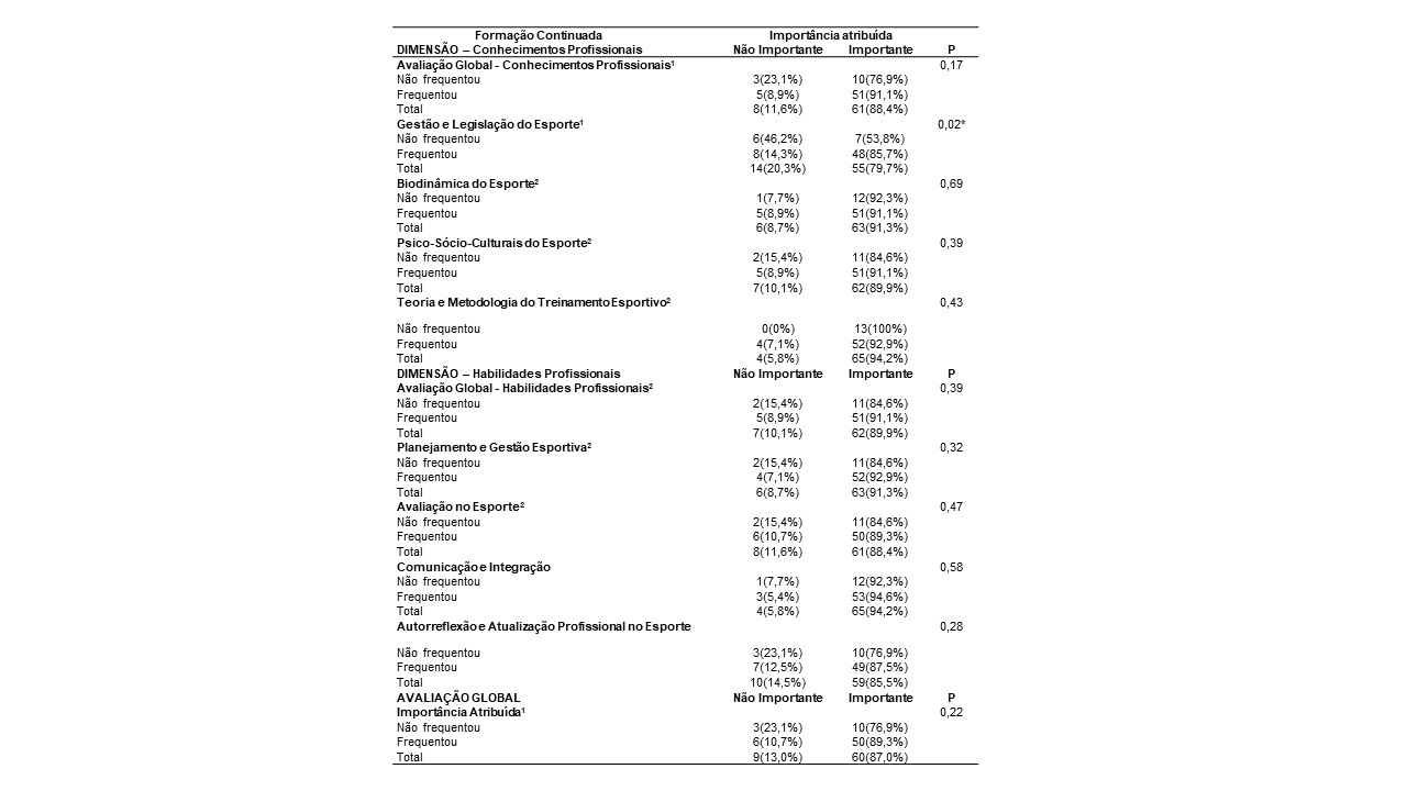 A importância atribuída aos assuntos evidenciados no constructo da competência profissional e a realização de curso de formação continuada apresentaram associação significativa apenas para o indicador Gestão e Legislação do Esporte (p=0,02) (Tabela 2), sendo que os resultados evidenciaram que o grupo de treinadores que frequentou cursos de formação continuada nos últimos anos apresentou índice mais elevado de importância atribuída (85,7%) que os treinadores que não participaram (53,8%).