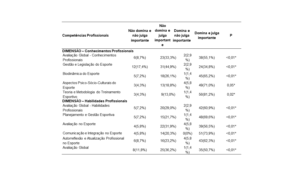 O percentual de treinadores que se julgaram com baixo domínio, mas que entendem que os assuntos abordados no constructo da competência profissional são importantes variou entre 13,0% e 44,9%. Destaca-se que, no mínimo, um quarto da amostra relatou a necessidade de ter maior domínio na Avaliação Global da Competência Profissional, nas dimensões Conhecimentos e Habilidades Profissionais e nos indicadores Gestão e Legislação do Esporte, Avaliação no Esporte, Biodinâmica do Esporte. Entretanto, o indicador que os treinadores evidenciaram maior necessidade de domínio foi Teoria e Metodologia do Treinamento Esportivo.