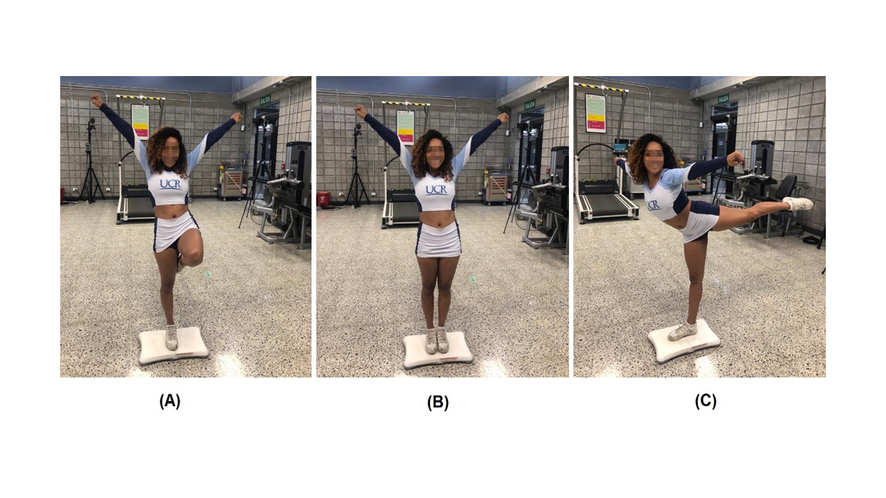 Las mediciones de las variables dependientes en pre test y pos test se realizaron de la siguiente manera: primero, se evaluó la estabilidad (desplazamiento total del centro de centro de presión) en bipedestación durante 10 s, luego la estabilidad en los elementos de stunt llamados liberty, awesome y arebesque durante 5 s cada uno; los elementos se midieron esa cantidad de segundos porque en las rutinas la ejecución de dichos elementos tiene una duración promedio de 4 tiempos musicales, es decir, alrededor de 3 s; además, el software que se utilizó puede medir como mínimo 5 s. Los sujetos solo tuvieron una oportunidad por cada posición y/o elemento. Es importante aclarar que en las variables de estabilidad solo se evaluó a las mujeres, debido a que en el porrismo son generalmente mujeres quienes cumplen la función de flyer.