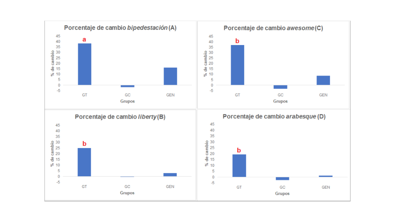 Se encontraron diferencias significativas en el porcentaje de cambio entre grupos, en las cuatro variables de estabilidad (tabla 2). En la variable bipedestación (A), se encontró diferencia significativa entre el GT y el GC, como se muestra en la figura 2. En las variables liberty (B), awesome (C) y arebesque (D), se encontró diferencia significativa entre el GT y los otros dos grupos (figura 1).