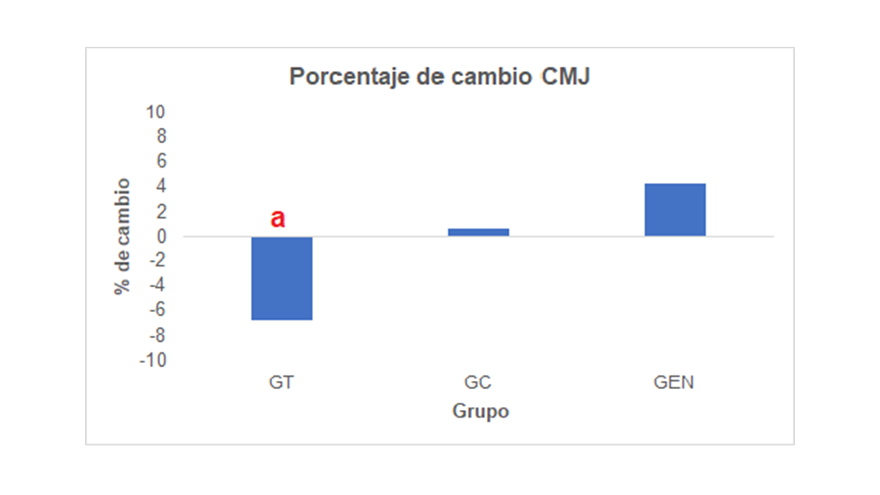 Como se muestra en la tabla 3, la variable salto con contra movimiento mostró diferencia significativa del porcentaje de cambio entre grupos, es decir, el GT es significativamente diferente del GEN (figura 2).
