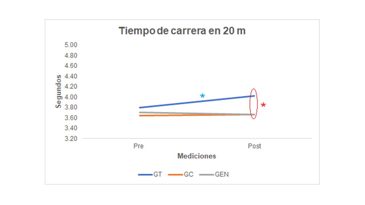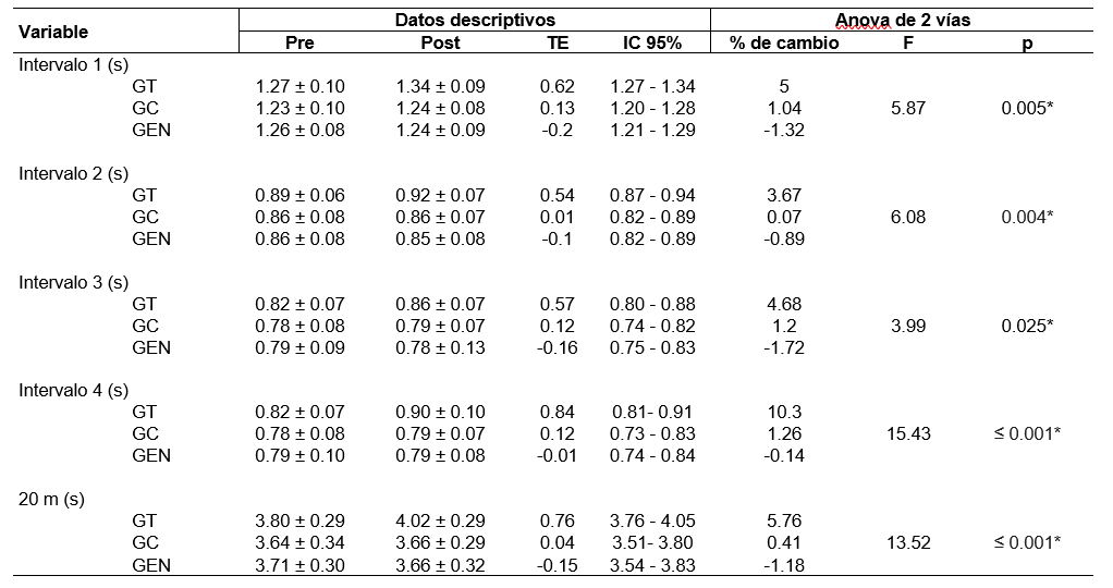 Como se describe en la tabla 4, las variables de velocidad intervalo 1, intervalo 2, intervalo 3 y 20 m mostraron interacción significativa en el análisis de ANOVA de 2 vías de tipo mixta. En la figura 3 se muestra que en un análisis post hoc evidenció que el GT disminuyó la velocidad en 20 m después del ET.