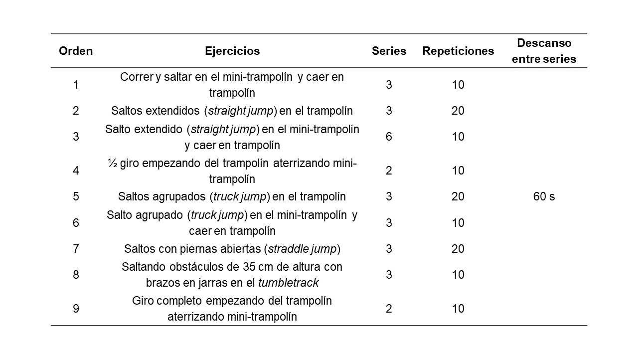 El tratamiento consistió en un entrenamiento acondicionamiento tradicional de trampolín, con una duración aproximada de 45 min y de acuerdo con los datos registrados con los dispositivos electrónicos (pulsómetro polar), con una intensidad del 70-85% de la frecuencia cardiaca máxima (FCM). El mismo incluyó progresiones, elementos básicos de gimnasia y ejercicios de pliometría (tabla 1). Por otra parte, debido a que este estudio es de efecto agudo se realizaron los pre test, seguido del entrenamiento e inmediatamente después el post test. El grupo GC no realizó ninguna actividad física, solo jugó un juego de mesa mientras se desarrollaba el entrenamiento. El grupo GEN realizó su entrenamiento normal de porrismo, que incluyó tres partes que generalmente se desarrollan: la primera, acondicionamiento físico, que consiste en ejercicios funcionales y progresiones de elementos gimnásticos; el segundo, gimnasia de piso, que consiste en la ejecución de elementos gimnásticos, aumentando progresivamente el nivel de dificultad y por último, elementos de construcción, los cuales se componen de stunts y pirámides, principalmente.