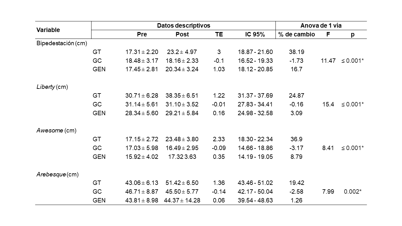 En las variables de estabilidad (bipedestación, liberty, awesome y arebesque), se evidenció que el GT tuvo un porcentaje de cambio significativamente mayor (p<0.05*) que el GC y el GEN, es decir, después del ET la estabilidad fue peor comparada con la condición control y entrenamiento normal.