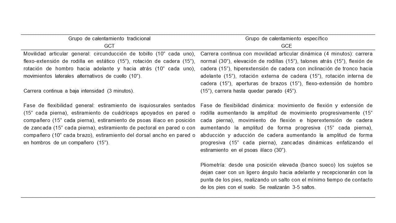 La muestra fue dividida en tres grupos de forma aleatoria. Un grupo no realizó calentamiento entre el pre-test y el post-test. Los otros dos grupos realizaron un calentamiento guiado con una duración total aproximada de 6-7 minutos (ver tabla 1).