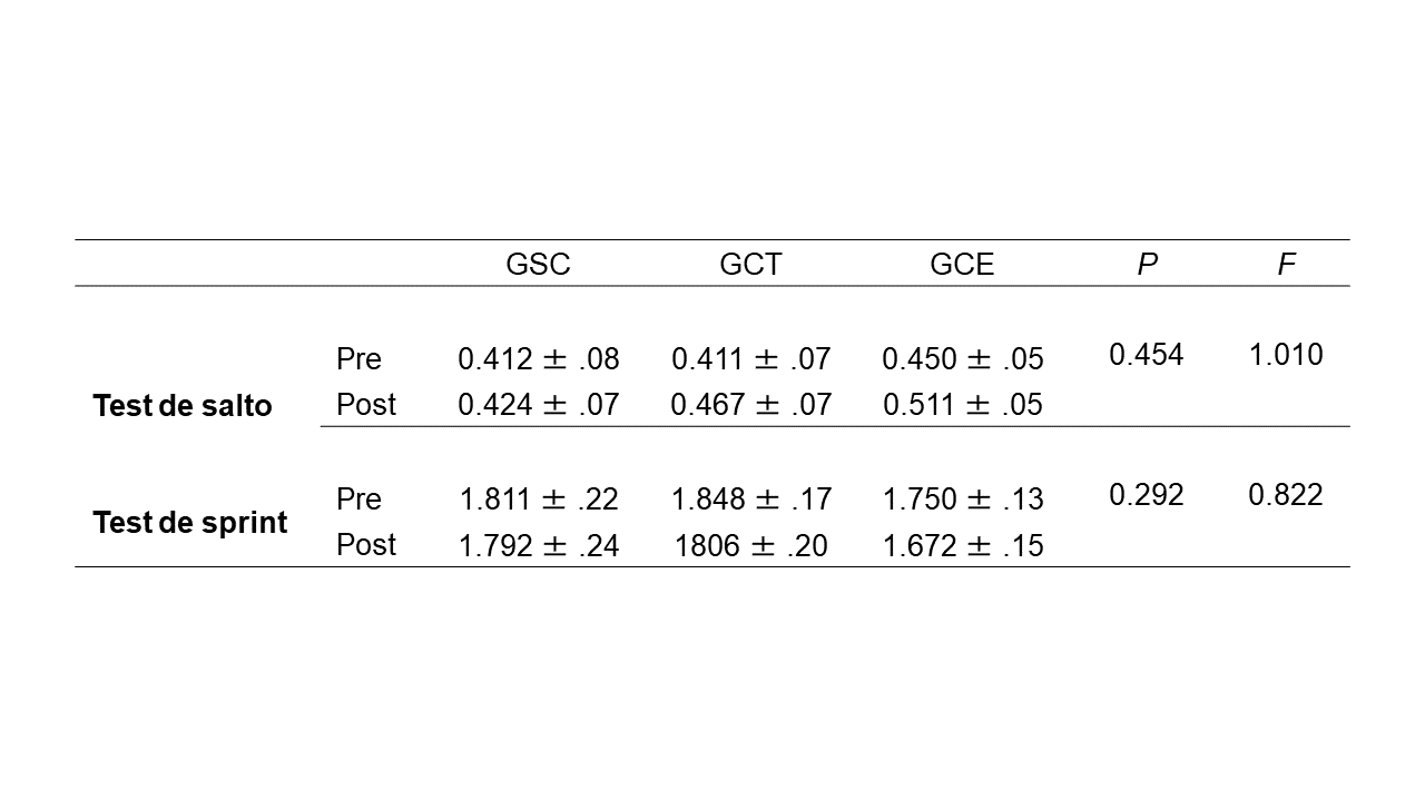 El ANOVA de dos vías mixto de 3 grupos x 2 mediciones (pre-post) mostró diferencias estadísticamente significativas (p = 0.032, F = 3.98) en el salto (figura 1). El análisis post hoc reveló diferencias estadísticamente significativas entre el pre-post del GCE (p = 0.002; g = 1.22), así como en el pre-post del GCT (p = 0.004; g = 0.76). Además, se encontraron diferencias estadísticamente significativas entre el GCE y el GSC en el post test (p = 0.045; g = 1.40).