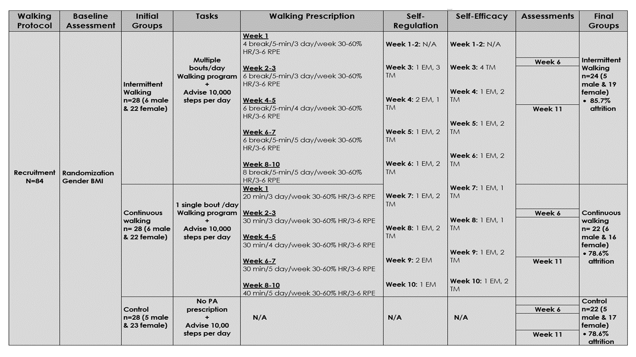 Following Cohen’s recommendations for a representative sample for behavioral analysis like physical activity (conservative calculation a1=.05, r=.30, and power =.80 with a desirable sample size of 68), eighty-four subjects were randomly assigned (based on initial BMI and gender) to one of three groups to complete a 10-week intervention, consisting of two walking protocols; intermittent walking and continuous walking. A third group served as the control group and were not given an exercise prescription nor self-regulatory training. Figure 1 shows the intervention design. Sixteen participants withdrew from the study during the first weeks of the intervention and data were removed from all analysis. Therefore, the final sample size was 22 for the continuous group, 24 for the intermittent group and 22 for the control group.