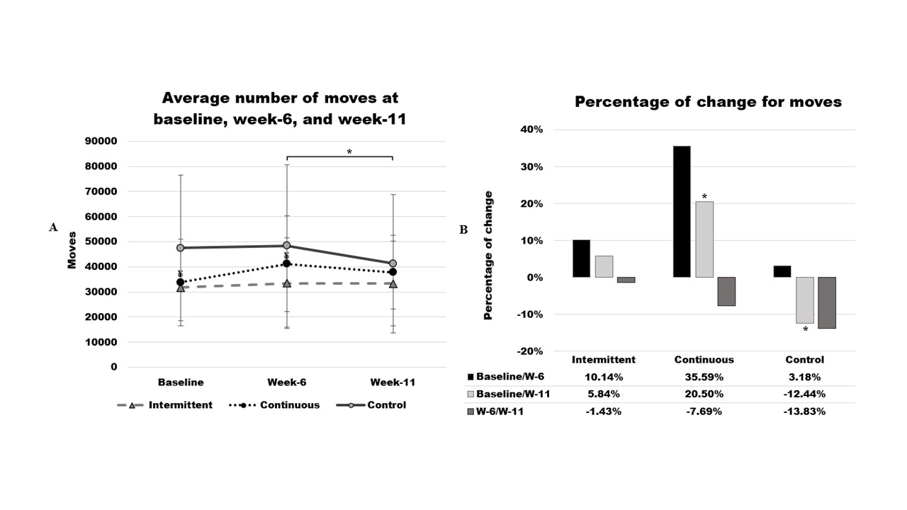 Figure 2 shows the average number of moves during the three weeks selected for evaluation and the corresponding percentage of change from baseline to week-6 and week-11.