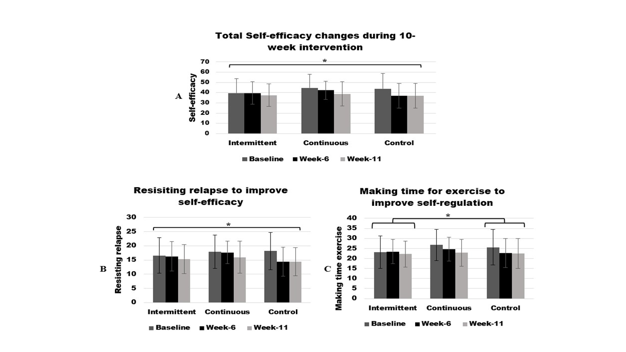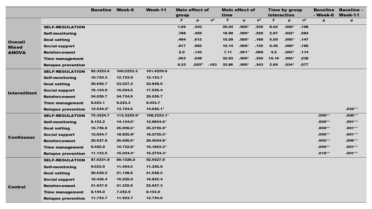 The results from the mixed-design ANOVA showed that total self-regulation changed as a main effect of time F(2,130) =20.140, p<.001, with a large effect size of n2=.236. When comparing self-regulation by group there was an interaction F(4,130) =8.017, p<.001, and a large effect n2= .198. Bonferoni post-hoc test showed that for the continuous group, overall self-regulation improved from baseline to week-6 (p<.001) and week-11 (p<.001). The intermittent walking group increased in relapse prevention from baseline to week-11 (p<.037). The control group did not change overall self-regulation at week-6 nor at week-11.
