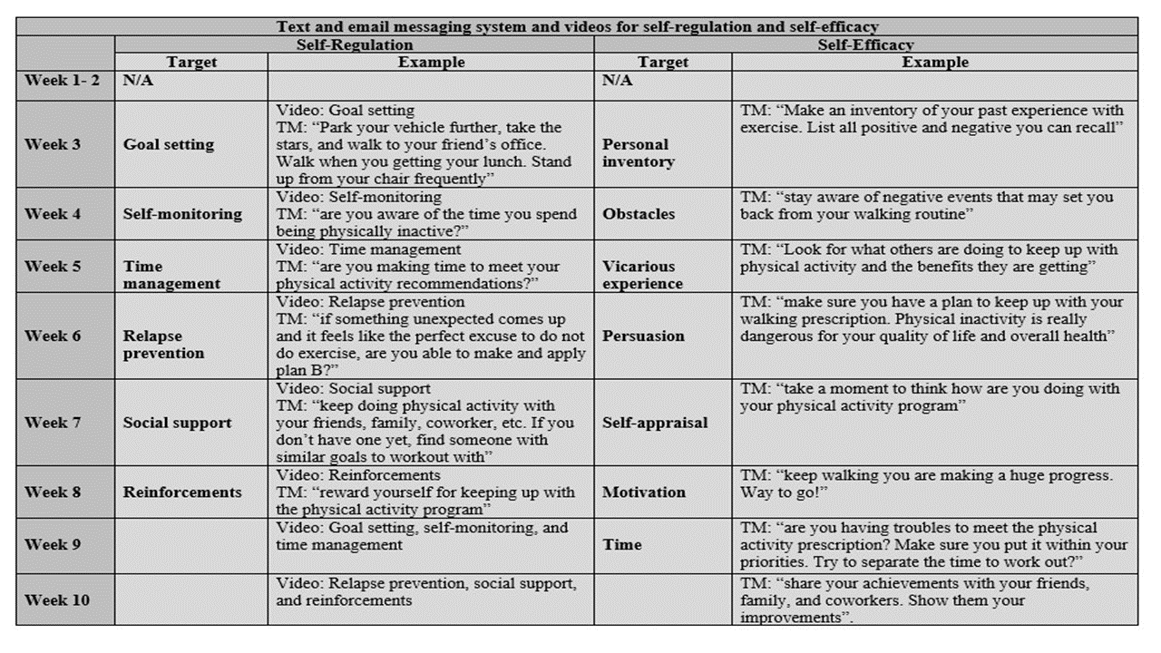 The 10-week walking prescription for the intermittent and continuous groups followed an incremental increase in walking behavior over 10-weeks. These two groups were targeted with weekly strategies to improve self-efficacy and self-regulation skills via text messages, e-mails and videos targeting specific variables as shown in table 1. All contents were linked to tactics to improve control over personal actions and to improve self-confidence in changing physical activity behavior. The control group had access to the MOVband account but did not have access to a walking program nor to self-regulatory or self- efficacy strategies sent via text messages, e-mails and videos.