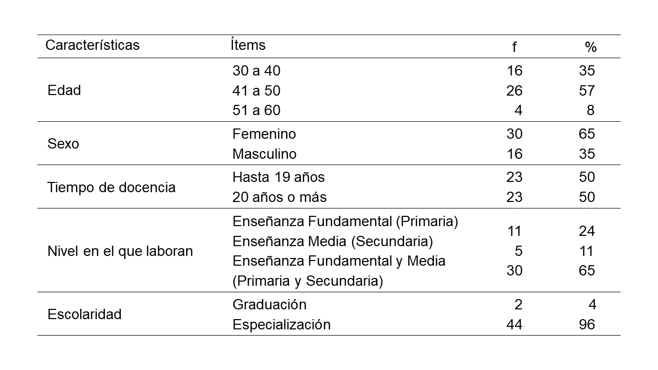 Participaron en la investigación 46 profesores de Educación Física (tabla 1), que laboraban en escuelas públicas del Estado de Paraná, tanto en Enseñanza Fundamental como en Enseñanza Media. La mayor parte de la muestra fueron mujeres, con edades entre 41 y 50 años y título de especialista. Respecto al tiempo como docentes, se percibió que el grupo estuvo constituido de forma equilibrada por profesores que laboraron en la profesión hasta 19 años y por profesores con ejercicio profesional de 20 años o más, pertenecientes a los últimos ciclos de la carrera docente.