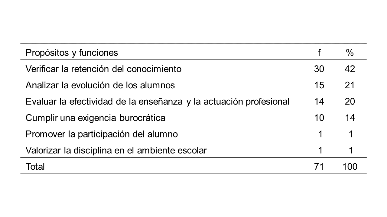 Los profesores investigados atribuían a la evaluación del aprendizaje en la Educación Física varios propósitos y funciones (tabla 2), relacionados tanto con una perspectiva cuantitativa, en la cual la intención era verificar la retención de los conocimientos, como la perspectiva formativa, en la que el foco de análisis era la evolución de los alumnos y evaluar la efectividad de la enseñanza y de la actuación profesional. Además de los propósitos relacionados con el proceso de enseñanza y aprendizaje, los profesores indicaron otros propósitos para la evaluación de los alumnos, como cumplir una exigencia burocrática y darle valor a la disciplina en el ambiente escolar.