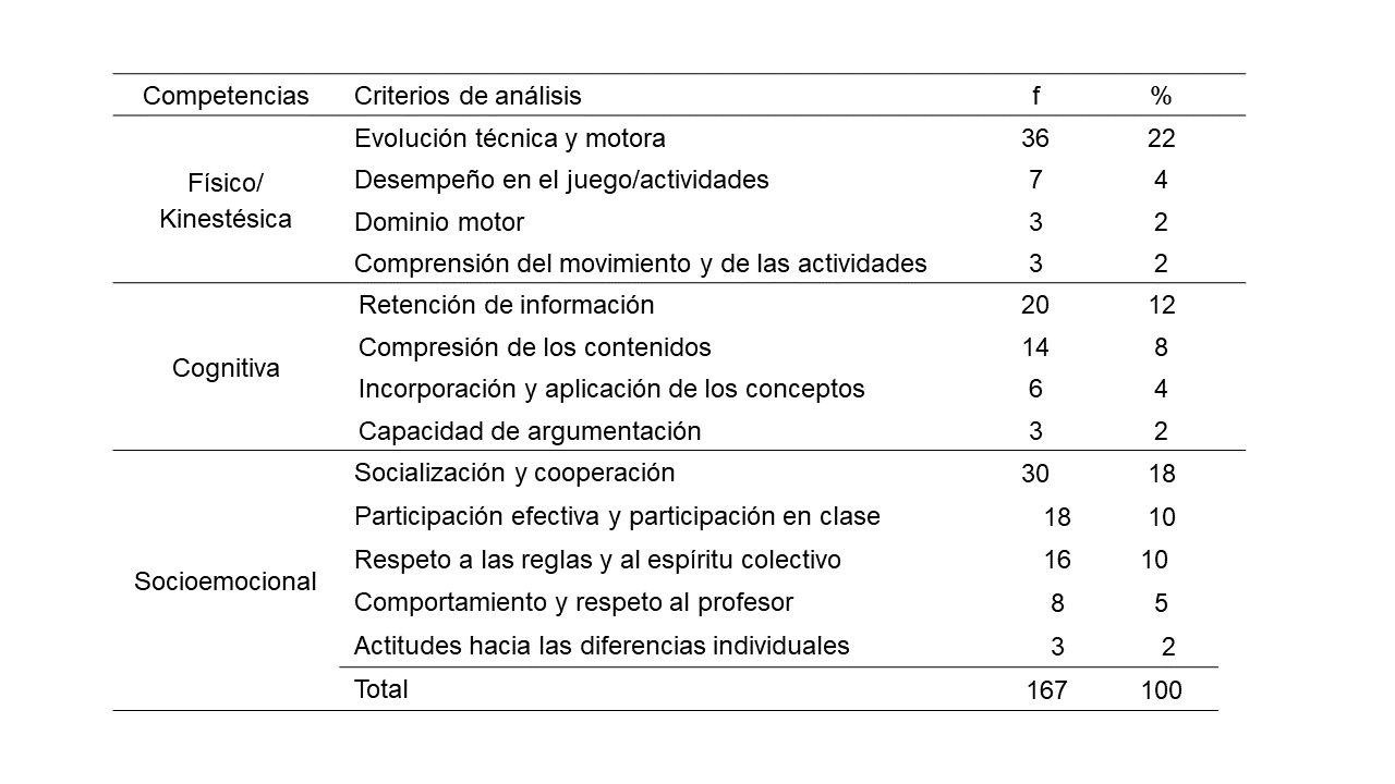 En el transcurso del proceso de evaluación, los profesores utilizaban diferentes criterios de análisis para las competencias físico-kinestésicas, socioemocional, y cognitiva (tabla 3). En la competencia físico-kinestésica, el criterio más utilizado fue la evolución técnica y motora, en la competencia socioemocional, la socialización y la cooperación y en la competencia cognitiva, la retención del conocimiento.