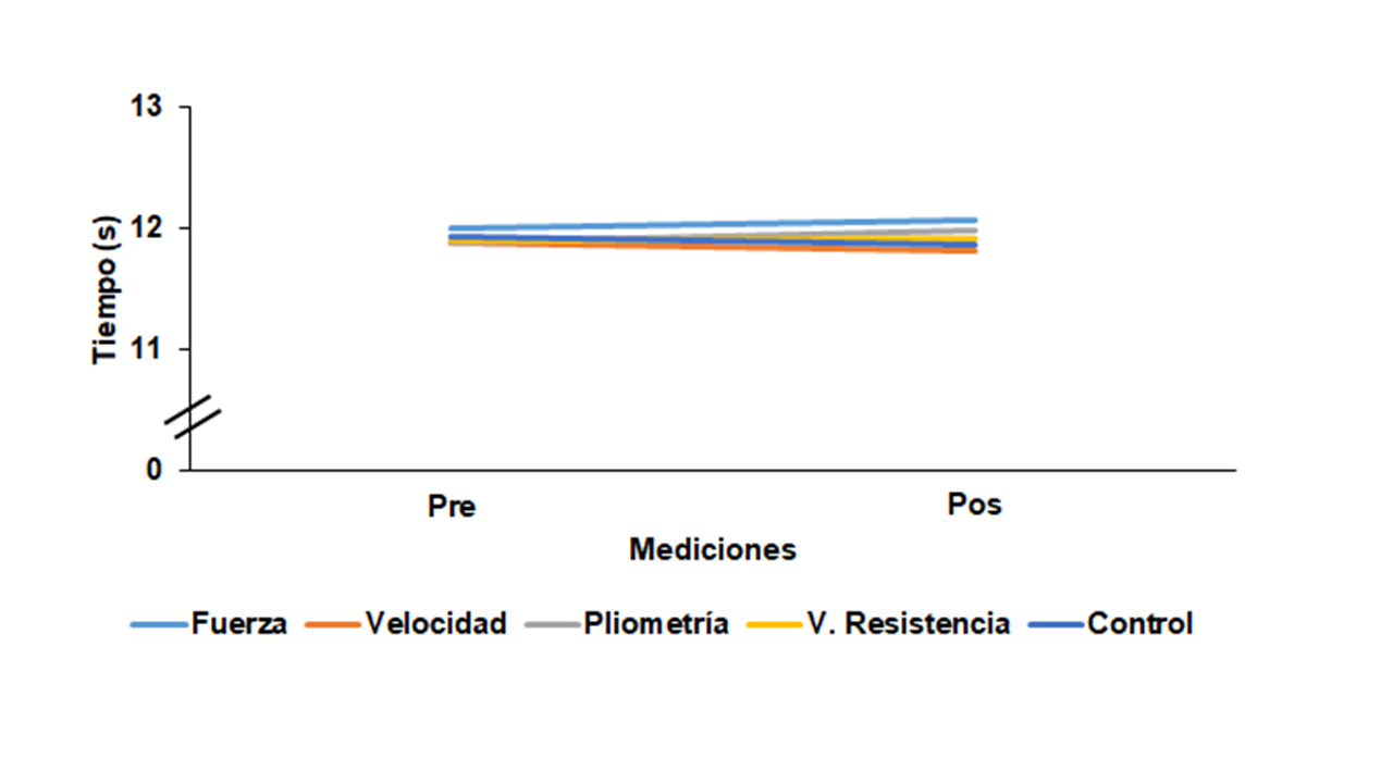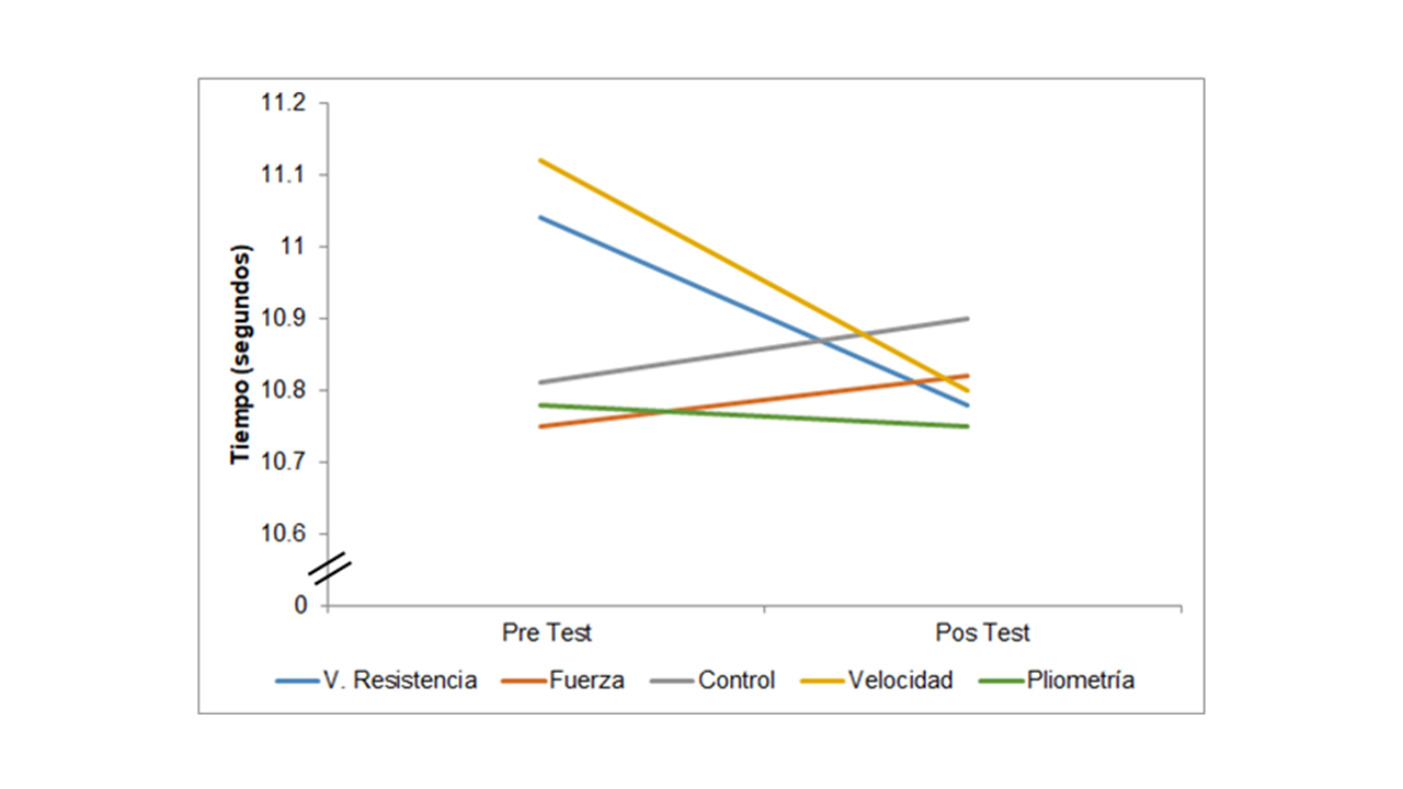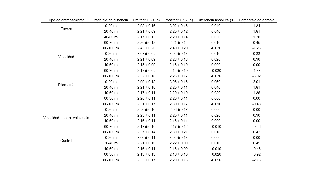 También, se muestra la estadística descriptiva de cada pre test y post test por cada intervalo de distancia en cada tipo de entrenamiento (tabla 4), donde los cambios más considerables se pueden observar en el quinto intervalo (80-100 m) para las condiciones de velocidad y control (7 y 5 centésimas, respectivamente).
