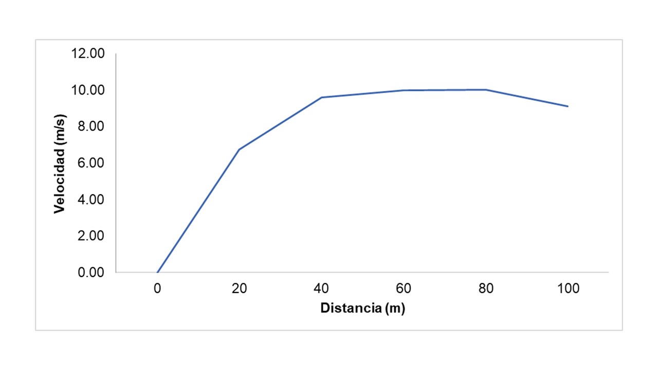 El test utilizado fue la prueba de 100 metros, la cual se midió como distancia completa y por intervalos de cada 20 metros, con el fin de observar el cambio en la velocidad en las distintas fases de la carrera de velocidad.
