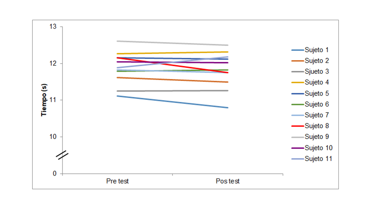 Respecto al análisis individual, en la figura 3 se presenta los cambios individuales de pre a post test para el tipo de entrenamiento de velocidad. Se puede apreciar cómo, de manera global, no hay efecto de los tipos de entrenamiento en el tiempo de carrera de 100 metros, pero en el análisis individual sí se observan cambios (positivos o negativos) en el tiempo de carrera entre los participantes para un mismo tipo de entrenamiento.