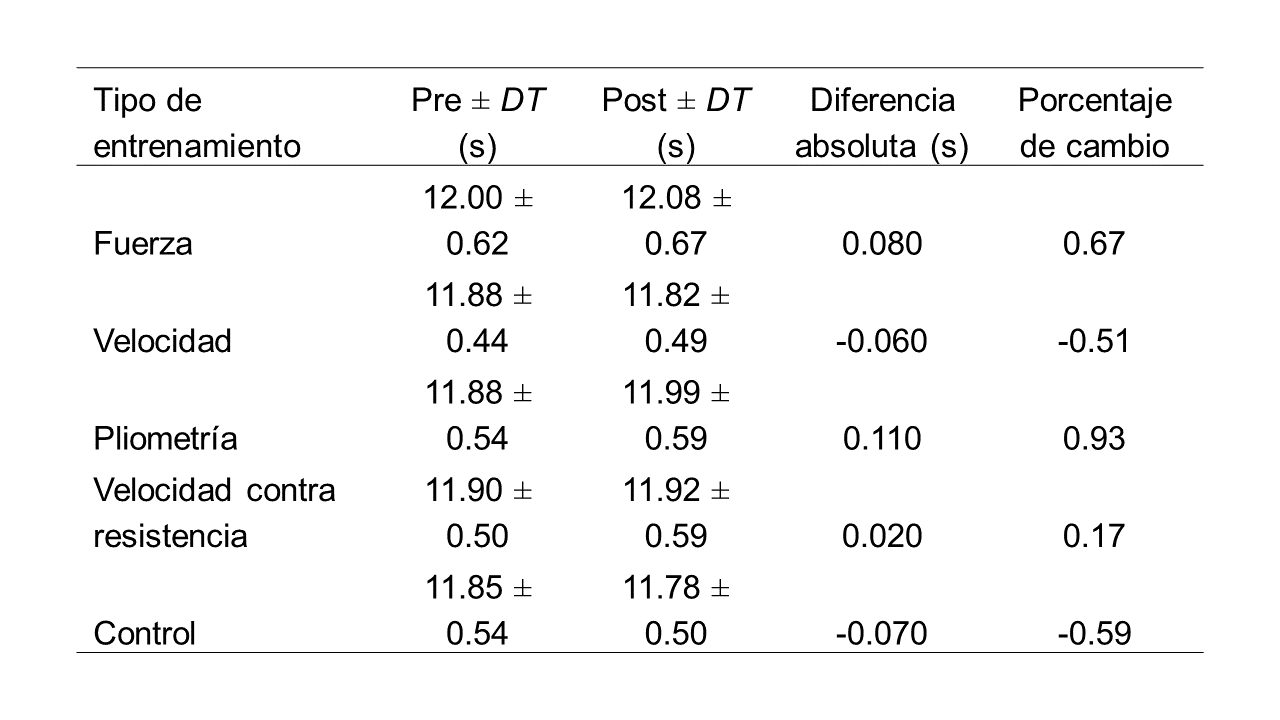 En la tabla 2 se presenta la estadística descriptiva de cada pre test y post test en la distancia total de 100 metros para cada tipo de entrenamiento. Se puede apreciar que solo las condiciones de velocidad y control muestran disminuciones en el tiempo de carrera de pre a post test, con porcentajes de cambio que representan cambios de 6 y 7 centésimas, respectivamente (Barquero Jiménez y Salazar Rojas, 2020).