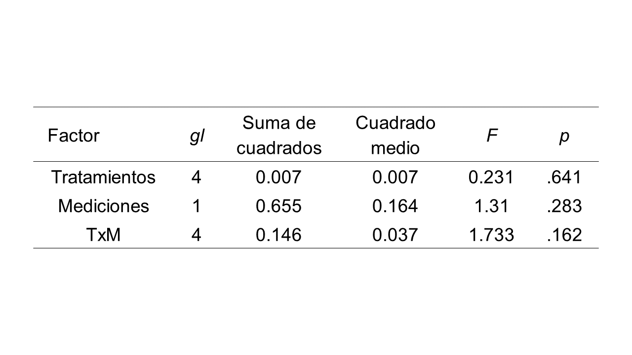 En la tabla 3, se presenta la información completa del análisis de varianza de 2 vías de medidas repetidas en ambos factores, donde se observa, al igual que en la figura anterior, la ausencia de interacción significativa entre los tipos de entrenamiento y las mediciones influenciando la carrera de velocidad.