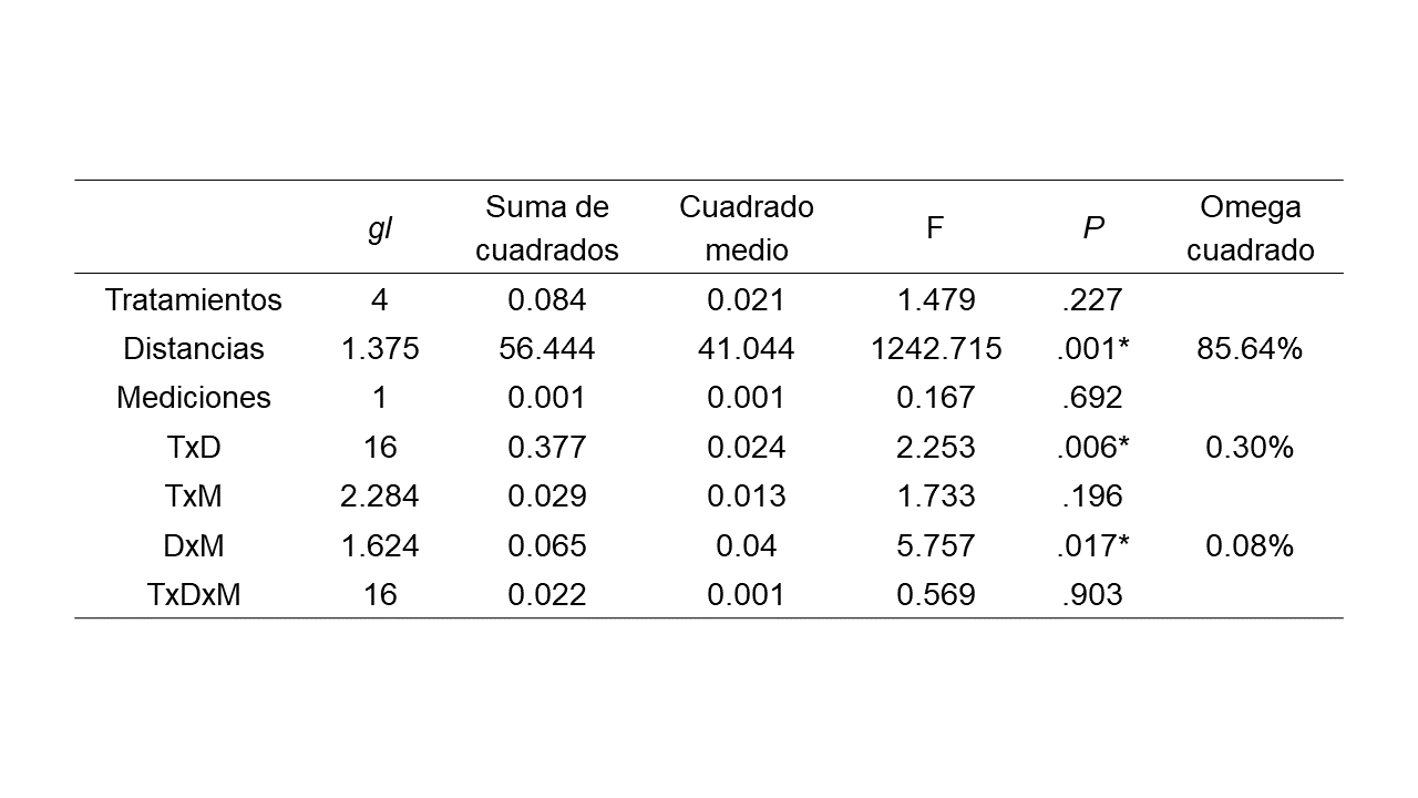 La interacción triple entre los factores mediciones, distancias y tipo de entrenamiento no resulta significativa (tabla 5). Lo anterior significa que no hay un cambio en la velocidad de carrera de pre test a post test para ningún tipo de entrenamiento en ningún intervalo de distancia.